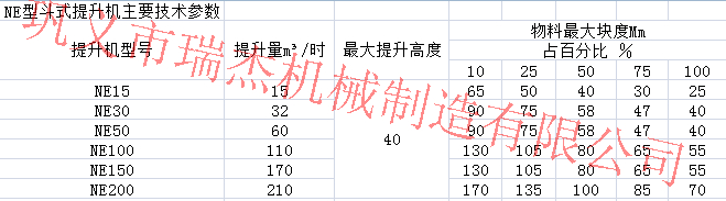 三.NE系列板鏈斗式提升機.NE系列板鏈斗式提升機是一種新型的斗式提升機,其采用板鏈傳動,區(qū)別于老型號TB系列板鏈斗式提升機,其命名方式采用提升量而命名而非斗寬。如NE150指的是提升量為150噸一小時而不是斗寬150。NE系列斗式提升機有著很高的提升機效率,根據(jù)提升速度不同還分有NSE型號及高速板鏈斗式提升機.NE系列斗式提升機主要技術參考圖: