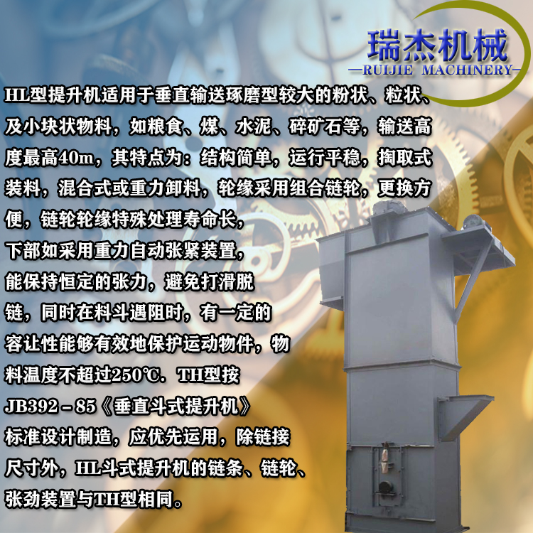 HL型斗式提升機是一種環鏈離心斗式提升機,升機有運行部分,斗與牽引鏈條,有傳動鏈輪的上部區段,帶有張緊鏈輪的下部區段,部機殼和驅動裝置組成.本提升機適于垂直輸送粉狀,用于垂直輸送磨琢性較大的粉狀、粒狀、及小塊狀物料,如糧食、煤、水泥、碎礦石等,輸送高度最高40m。